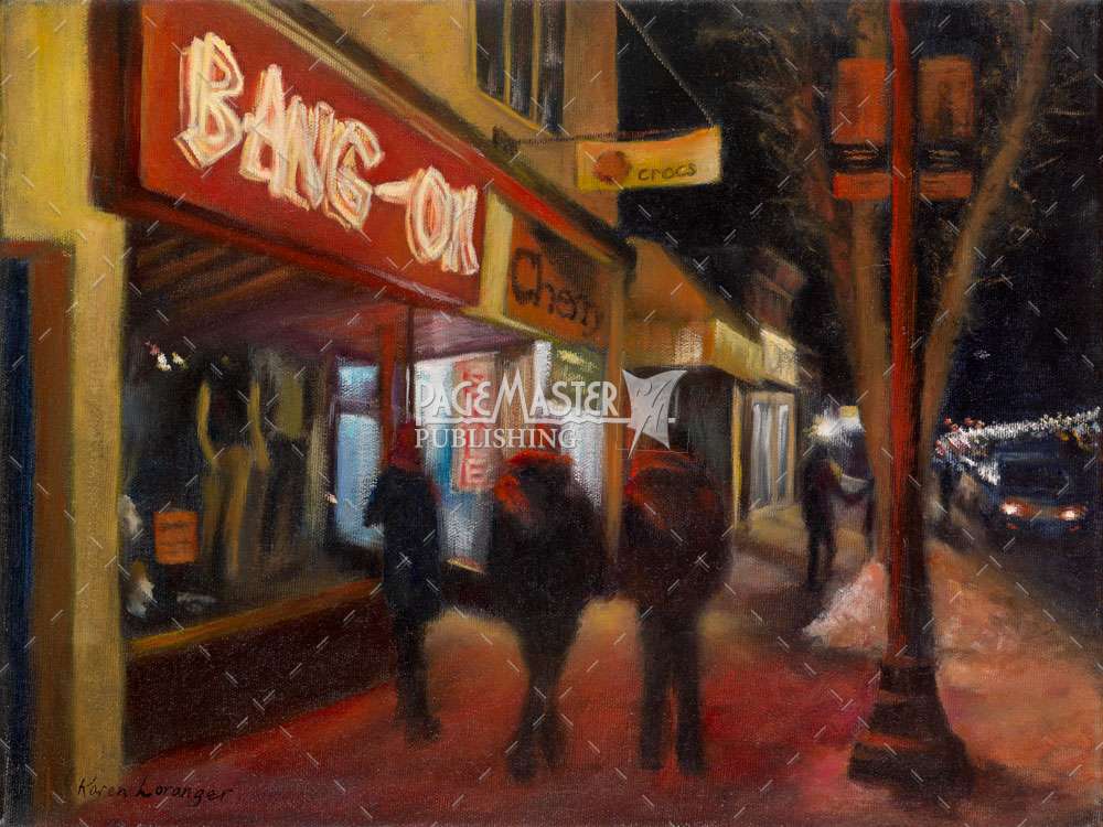Archival print of Bang on Whyte by Karen Loranger. Part of the Nights on Whyte series featuring historic Old Strathcona in Edmonton