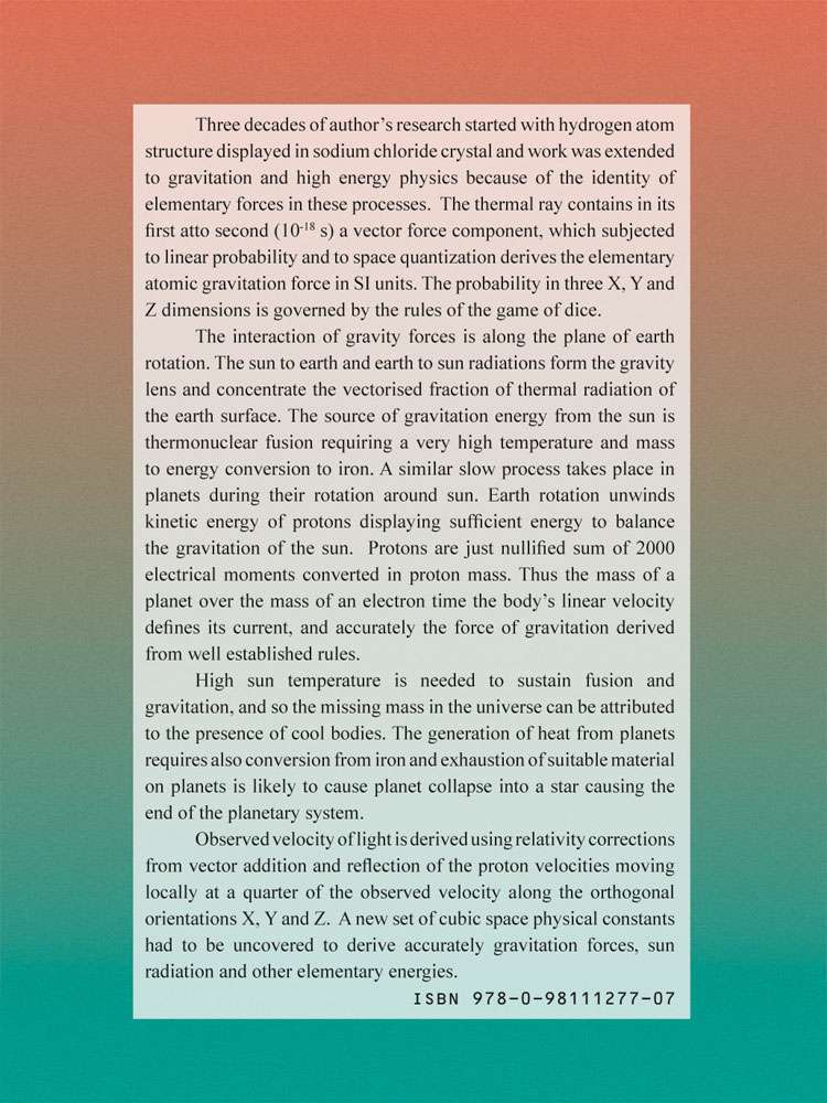 Three decades of authorโs research started with hydrogen atom structure displayed in sodium chloride crystal and work was extended to gravitation and high energy physics because of the identity of elementary forces in these processes. The thermal ray contains in its first atto second (10-18 s) a vector force component, which subjected to linear probability and to space quantization derives the elementary atomic gravitation force in SI units. The probability in three X, Y and Z dimensions is governed by the rules of the game of dice. The interaction of gravity forces is along the plane of earth rotation. The sun to earth and earth to sun radiations form the gravity lens and concentrate the vectorised fraction of thermal radiation of the earth surface. The source of gravitation energy from the sun is thermonuclear fusion requiring a very high temperature and mass to energy conversion to iron. A similar slow process takes place in planets during their rotation around sun. Earth rotation unwinds kinetic energy of protons displaying sufficient energy to balance the gravitation of the sun. Protons are just nullified sum of 2000 electrical moments converted in proton mass. Thus the mass of a planet over the mass of an electron time the bodyโs linear velocity defines its current, and accurately the force of gravitation derived from well established rules. High sun temperature is needed to sustain fusion and gravitation, and so the missing mass in the universe can be attributed to the presence of cool bodies. The generation of heat from planets requires also conversion from iron and exhaustion of suitable material on planets is likely to cause planet collapse into a star causing the end of the planetary system. Observed velocity of light is derived using relativity corrections from vector addition and reflection of the proton velocities moving locally at a quarter of the observed velocity along the orthogonal orientations X, Y and Z. A new set of cubic space physical constants had to be uncovered to derive accurately gravitation forces, sun radiation and other elementary energies.